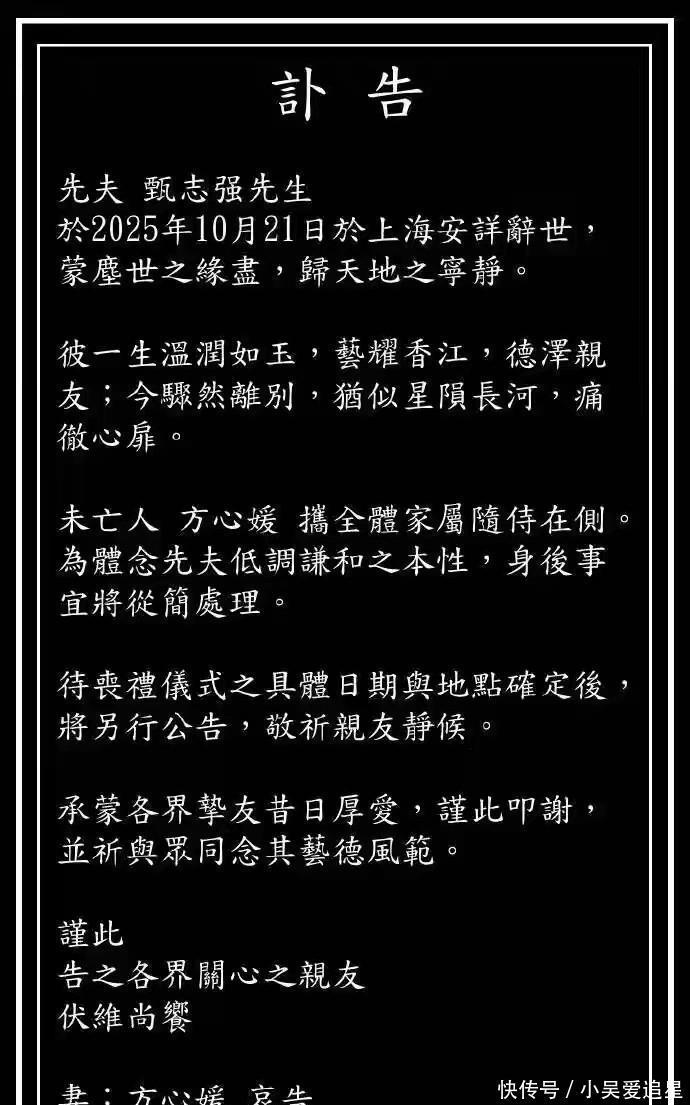 甄志强先生的妻子方心媛女士在讣文中表达了深切的哀痛,称“痛彻心扉”。她同时表示,甄先生的身后事宜将一切从简处理,具体葬礼安排将另行公告。